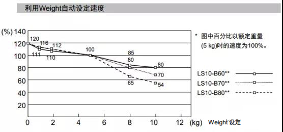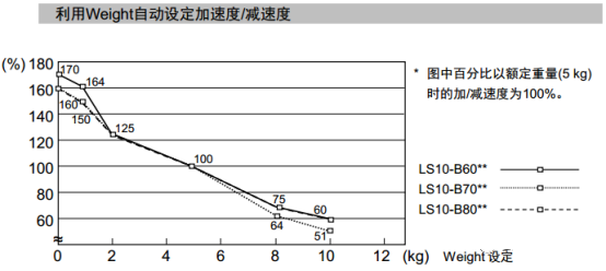 在滿足工況需求的情況下,希望末端重量越小越好。因為設定weight后,會自動設定機器人運動的速度和加減速。重量越小,加減速越快,能達到的最高速度越搞,同樣路徑的CT更短。Weight對速度和加減速的影響曲線如下所示(以LS10為例):