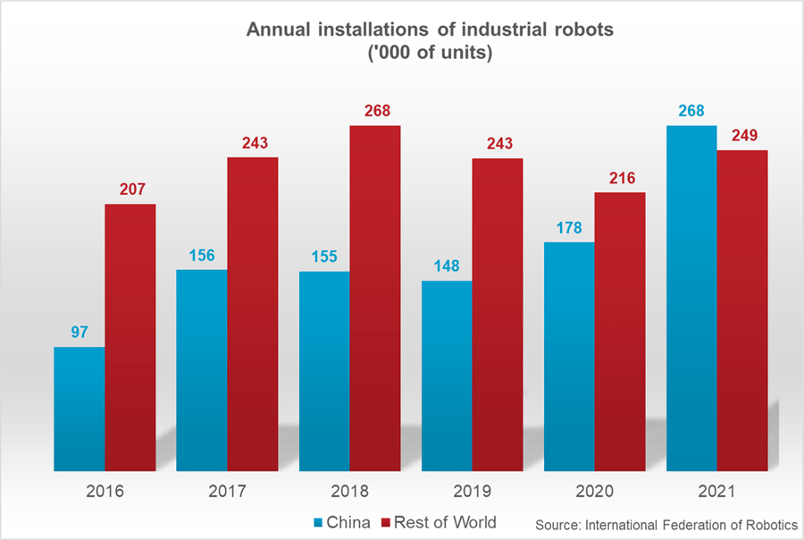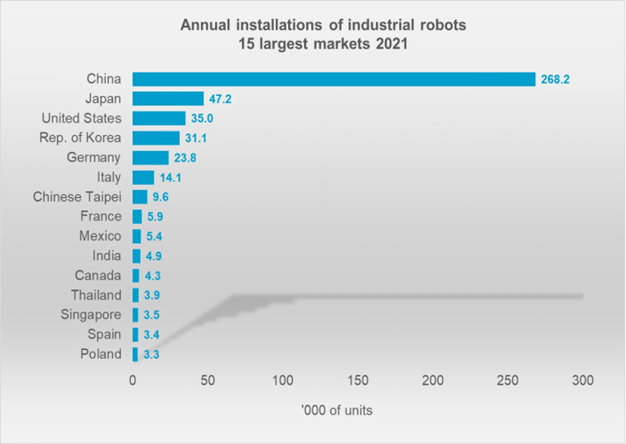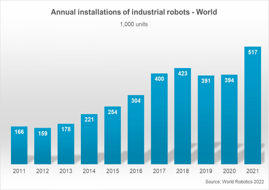 國際機器人聯(lián)合會IFR近期發(fā)布數(shù)據(jù)顯示,2021年全球新裝工業(yè)機器人達51.7萬臺,同比增長31%,創(chuàng)歷史新高,近五年年均增長11%。
