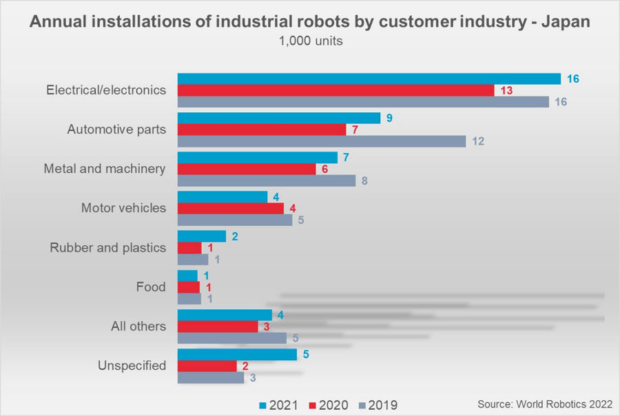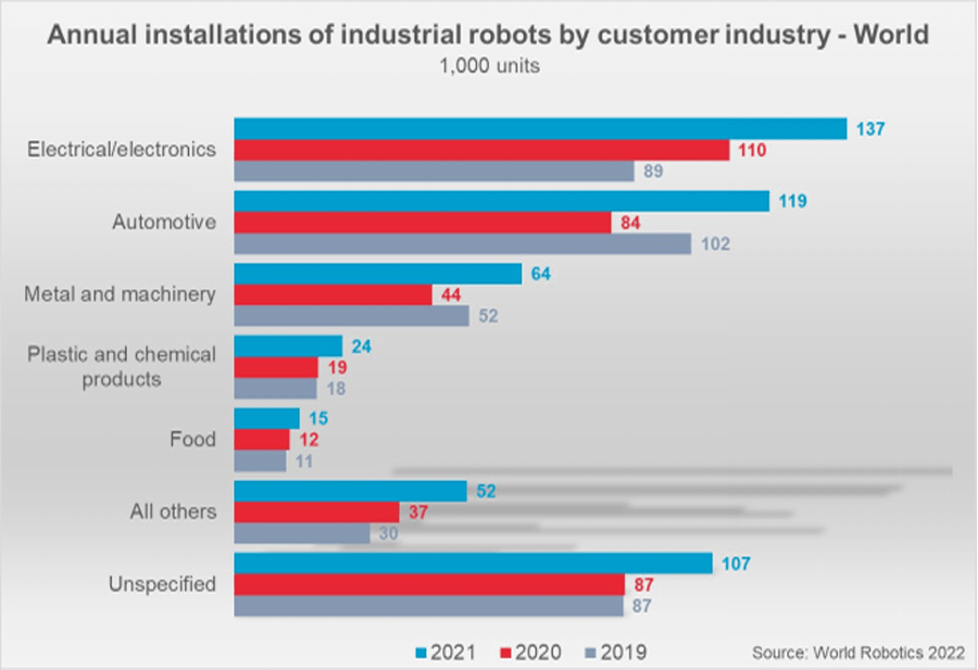 盡管過去兩年因新冠疫情影響,全球制造業(yè)供應鏈受到較大沖擊,但2021 年主要用戶領(lǐng)域?qū)C器人的需求仍顯示出強勁增長態(tài)勢。圖3 為近三年全球主要工業(yè)機器人應用領(lǐng)域的裝機量,在中國市場的拉動下,電氣/ 電子行業(yè)對機器人的需求量最高,之后依次為汽車、金屬和機械制造1、塑料和化學制品、食品等。